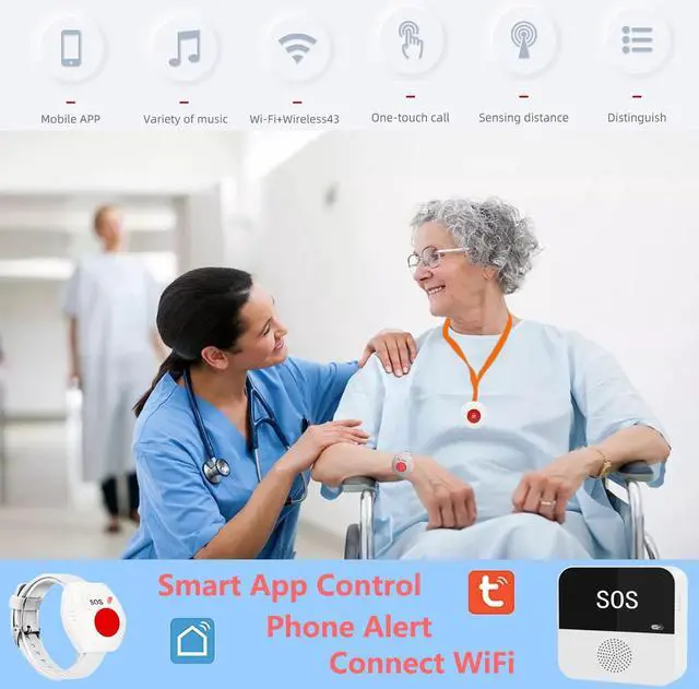 Multifunctional Receiver: A round call button can be hung on the neck or pasted on the wall with Double-sided tape; A watch call button can be easily worn on the wrist, Ip55 Waterproof grade, call distance up to 1000+ feet; Receiver powerd by data cable No need to replace the battery, 12 ringtones for choices, Connect to the Tuya smart app, All functions can be operated on the app ^^ Receiver Function and