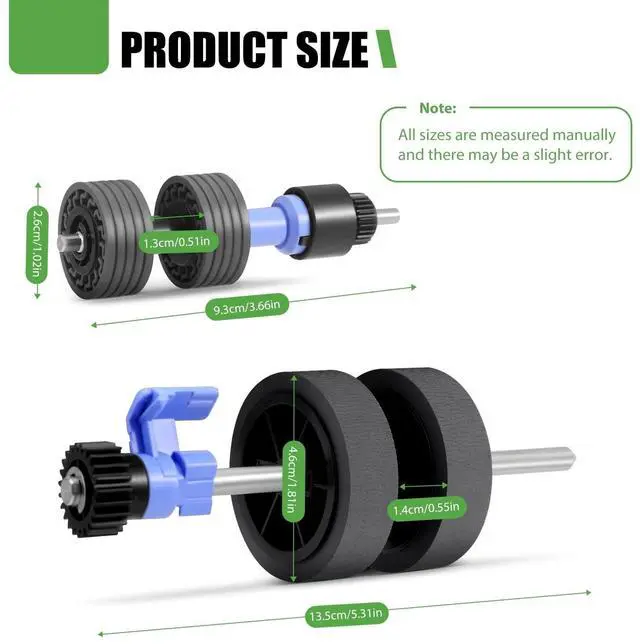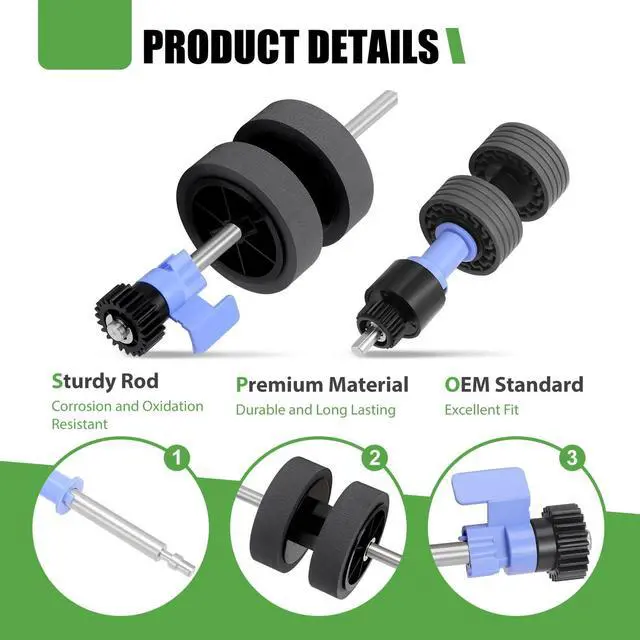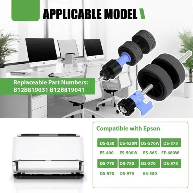 Features: CompatibilityThe scanner roller assembly kit compatible with Epson scanner models including DS-530, ES-400, ES-500W, ES-865, FF-680W, DS-530N, DS-570W, DS-575, DS-770, DS-780, DS-780N, DS-870, DS-875, DS-970, DS-975, ES-580, ES-575W. Replace Part NumberThe B12B819031 scanner exchange roller kit is a direct replacement for B12B819041, ensuring seamless integration with supported scanners. Premium MaterialCrafted from high-quality raw materials, the B12B819031 B12B819041 scanner rollers feature a compact design for smooth rolling, reduced wear, and noise levels. This ensures enhanced scanning accuracy, stability, and the ability to handle large scan volumes. The rollers facilitate accurate and smooth paper feeding, addressing common issues like paper jams and feeding errors, thereby improving overall work efficiency. Easy InstallationWith a simple plug-and-play design, the scanner roller assembly kit can be installed without the need for specialized skills. This easy installation process saves time and costs associated with maintenance, allowing for quick restoration of scanning functionality.