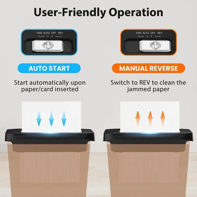 Convenient Use: This document shredder has 4-mode control switches (Auto, Off, Rev and Forward); Auto start, stop and manual rev functions simplify shredding and paper jam clearing process ^^ Reliable Customer