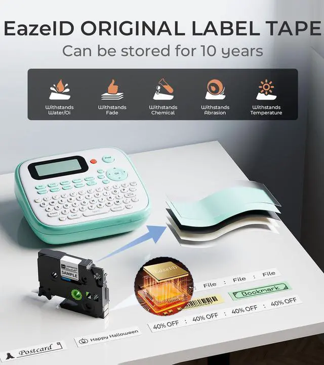 - : EazeID D210s label maker machine uses thermal transfer printing, using 12mm 0.47 laminated white tape, making them durable, waterproof tape, scratch-resistant, fade-proof, and temperature-resistant. They're perfect for a wide range of uses, like labeling jars, creating logos, tagging items, and organizing both at home and in the office