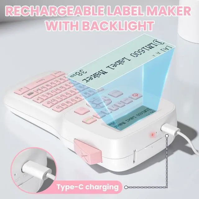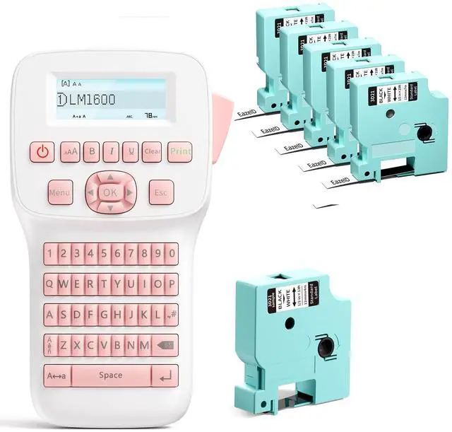 Label Maker Machine with 6PK White Tapes, Rechargeable Pink Label Maker with Keyboard, Bluetooth Labeler Machine LM1600, Backlit Screen, Multiple Symbol Icon Style Templates Easy to Use Inkless
