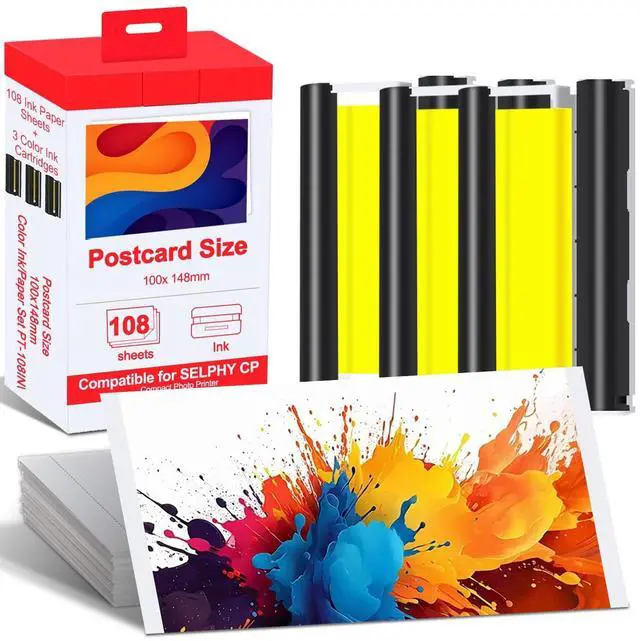 Specification: compatible for canon selphy cp1500 cp1300 kp-108in ink cartridge and paper set includes 3 color ink cassettes and 108 sheets photo paper.