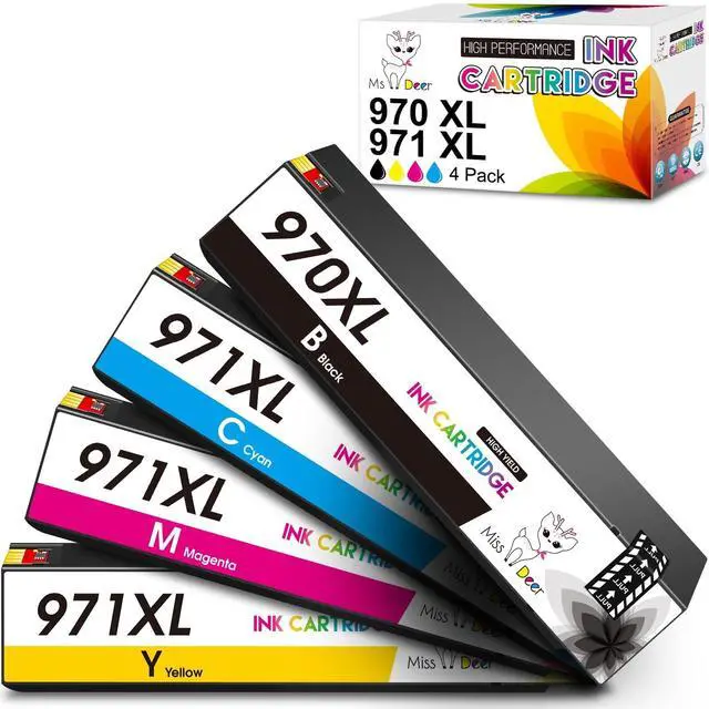 X576dw MFP Printer ^^: Prevent Ink Leakage. Total of 4 Pack 970 971 Ink Cartridges. Package includes 1 x User Guide, 1 x Disposable gloves, 1 x Black, 1 x Cyan, 1 x Magenta, 1 x Yellow Ink Cartridges, Replacement for HP 970XXL 971XXL. Uses new packaging that is more robust and aesthetically pleasing ^^: More ink capacity. Each 970 black ink can print approximately 9200 pages. Each 971 color ink cartridge can print approximately 6600 pages. (at 5% coverage of A4/Letter Paper, for information purposes only). Extended capacity cartridges deliver more prints per cartridge, making them ideal for high-volume printing needs ^^: Miss Deer 970 971 ink cartridges can be used for copy paper and photo paper. Specially formulated 970XL 971XL Ink Cartridges make sure to print crisp documents and life-like photos. Sharp and smooth, Vibrant color, Prevents