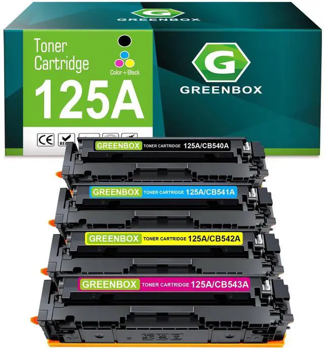 Contents: 4 pack replacement for 125A toner cartridge - 125A*1 black (CB540A) + 125A*1 cyan (CB541A) + 125A*1 yellow (CB542A) + 125A*1 magenta (CB543A) ^^ GREENBOX Compatible for 125A toner cartridge provides clear text and graphics, print the color effect you want on the paper