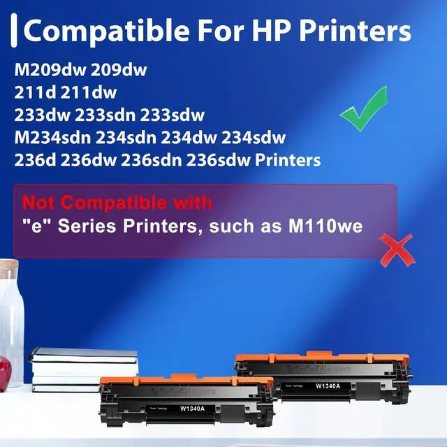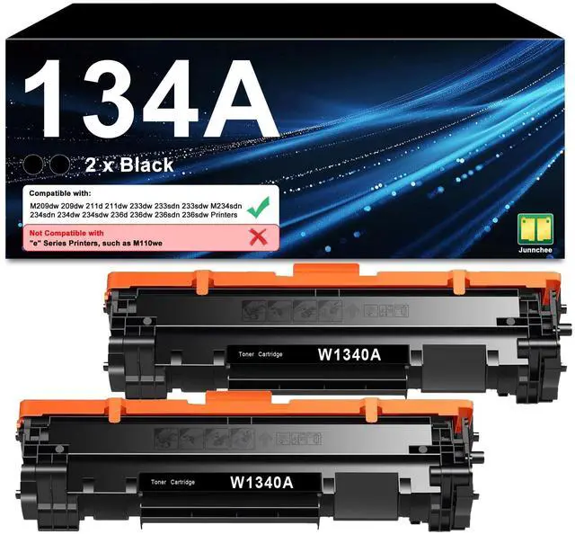 NOTICE The 134A Toner Cartridges are Not compatible with "e" series printers, like M209dwe M234dwe M234sdne M234sdwe printer ^^ Compatible Printer for M209dw MFP M234dw M234sdw Printer (Not for Contract Printers Suffixed with "e") ^^ High Yield Up to 1, 200 pages per 134A W1340A black toner cartridge ^^ Package Contents 2-Pack, 134A Toner Cartridge, W1340A ^^ Excellent Performance all Toner Cartridge are tested to the most rigorous quality, ensure smooth, clean printed text and vibrant color images