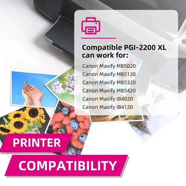 This package contains a total of 8 packs of new compatible, including 2x PGI-2200XL black, 2x PGI-2200XL cyan, 2x PGI-2200XL magenta, and 2x PGI-2200XL yellow, non-original pigment ink cartridges. ^^ With a page yield of approximately 2500 pages per PGI-2200XL black cartridge and 1500 pages per PGI-2200XL color cartridge (at 5% coverage for A4 size paper), these XL ink cartridges offer more ink capacity and work just like the standard cartridges. ^^ Our PGI-2200XL ink cartridge set is compatible with a range of Canon printers, including Canon Maxify MB5020, Canon Maxify MB5120, Canon Maxify MB5320, Canon Maxify MB5420, Canon Maxify iB4020, and Canon Maxify iB4120.