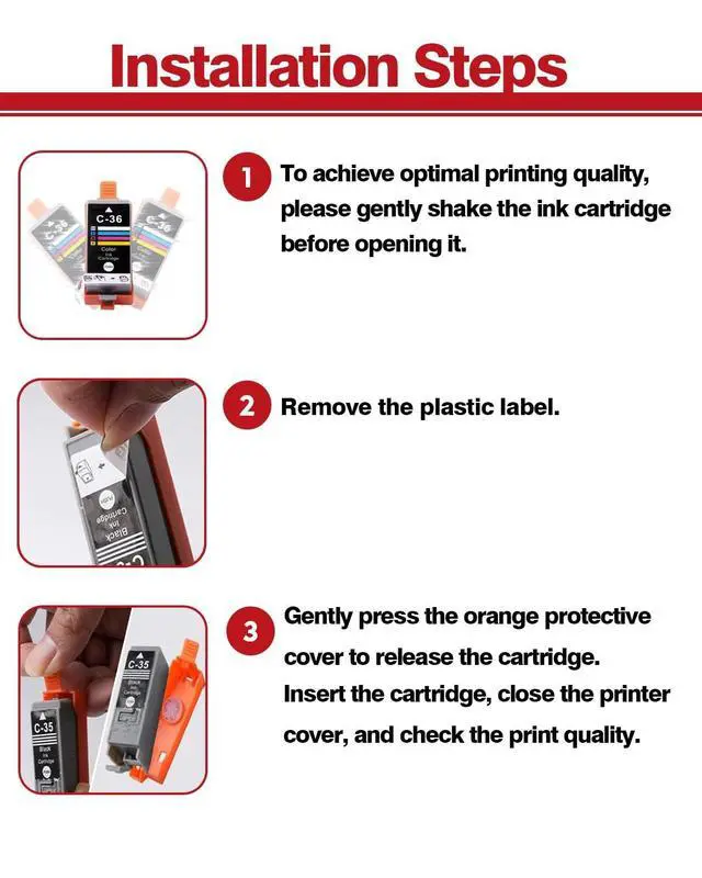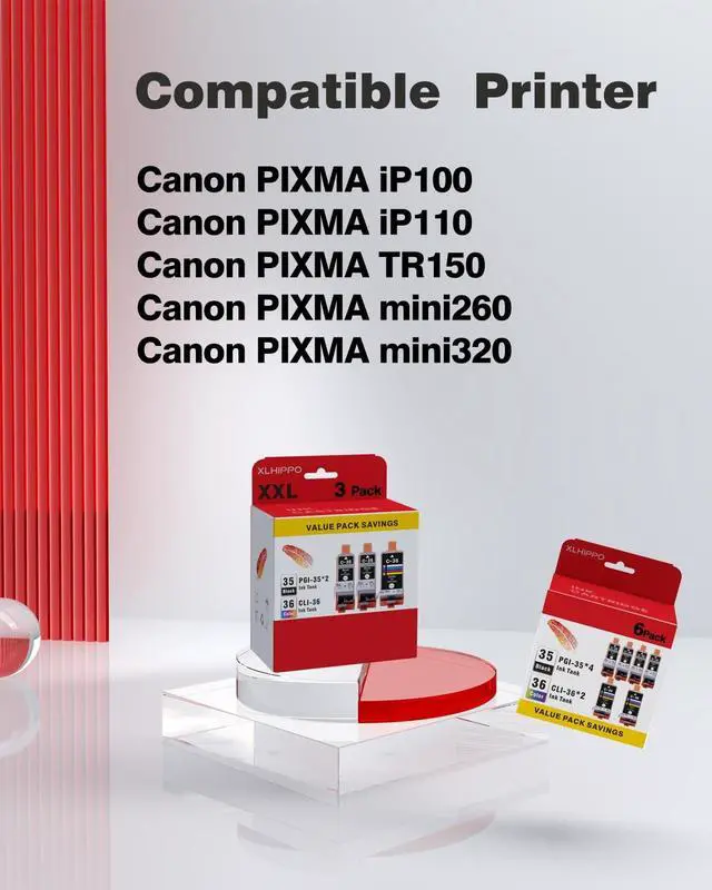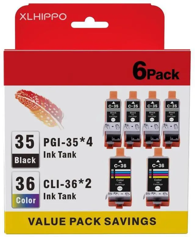 Ensure uninterrupted printing with this 6-pack of PGI-35 black and CLI-36 color ink cartridges, designed as a replacement for Canon 35 and 36 ink cartridges. Compatible with Canon PIXMA IP110, TR150, IP100, MINI260, and MINI320 printers, this set includes 2 black and 1 tri-color cartridge. Effortlessly produce vibrant, high-quality prints with these genuine replacement cartridges. Enjoy hassle-free printing and cost-effective replacements for your Canon printer.