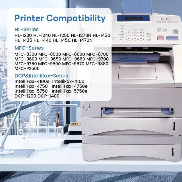 ^^ Printer Compatibility: IntelliFax-4100e IntelliFax-4100 IntelliFax-4750 IntelliFax-4750e IntelliFax-5750 IntelliFax-5750e HL-1230 HL-1240 HL-1250 HL-1270N HL-1430 HL-1435 HL-1440 HL-1450 HL-1470N MFC-8300 MFC-8500 MFC-8600 MFC-8700 MFC-9600 MFC-9650 MFC-9660 MFC-9700 MFC-9750 MFC-9800 MFC-9870 MFC-9880 MFC-P2500 DCP-1200 DCP-1400 Printer ^^