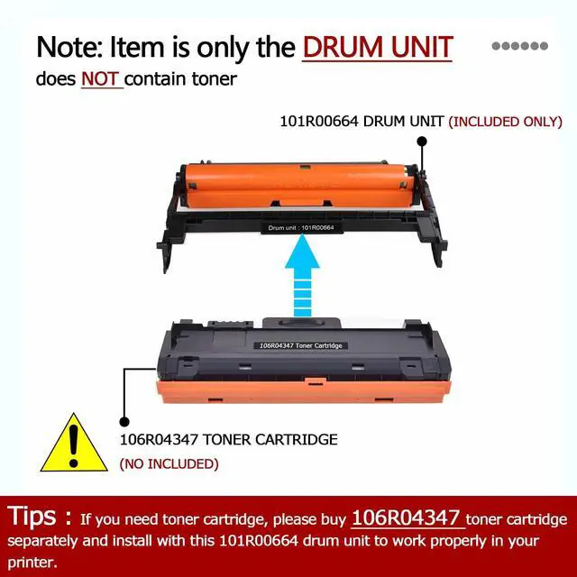 The item is only the 101R00664 drum unit, not contain toner. You need to use with 106R04347 or 106R04346 toner cartridge. ^^ Compatible Printer - Perfectly Compatible with B210 B210DNI B205 B205NI B205MFP B215 B215DNI B215MFP Printer series. ^^ Page Yield - Black 10, 000 Pages at 5% coverage ISO/IEC 19752 (letter/A4). ^^ After-sales Service - We always stand by for your needs, even though refund window is close. ^^ Quality Standard - All cartridges are certified by ISO 9001 quality assurance and ISO 14001 environmental management.