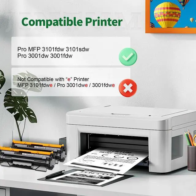 Warning: This 138a toner cartridge can only be used in MFP 3101fdw 3101sdw / Pro 3001dw 3001fdw printers and is not compatible with printers with an "e", for