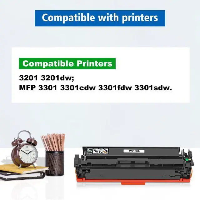 Package Contents -- Include 1 pack 218A W2180A black toner cartridge already installed with chips, deliver a smooth, efficient printing experience every time. ^^ Printer Compatibility -- Compatible with 3201 3201dw MFP 3301 3301cdw 3301fdw 3301sdw series Printers. ^^ High Page Yields -- Standard capacity up to 1, 300 pages per black toner cartridge (at 5% coverage on A4 paper, based on ISO/IEC 19752). ^^ Superior Print Quality -- Our refined toner powder and high-quality cartridges work together to deliver accurate, vibrant colors, sharp blacks, and crisp graphics for professional-grade results every time.
