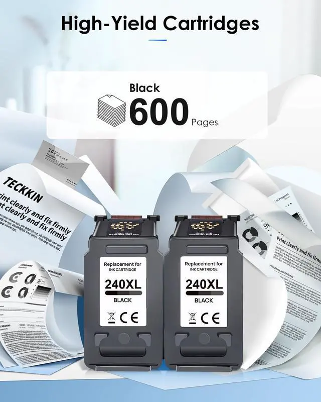 High Page Yield: Up to 600 pages per 240xl black ink cartridge. 1, 200 pages in total based on 5% coverage ^^ All TECKKIN 240XL black ink cartridge for canon 240xl black ink cartridges are filled with premium ink and equipped with the latest upgrade intelligent chips, which is matched with advanced production technology and strict quality inspection process to ensure the high printing quality of each 240 ink cartridge. Bring you clear print text and bright vibrant images ^^
