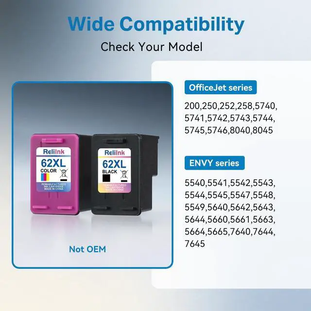 ^^ Wide Printer Compatibility: ReliInk for hp ink 62xl black and color combo pack is compatible with many printers, including HP Envy 5540 5541 5542 5543 5544 5545 5547 5548 5549 5640 5642 5643 5644 5660 5661 5663 5664 5665 7640 7644 7645 OfficeJet 200 250 252 258 5740 5741 5742 5743 5744 5745 5746 8040 8045. Whether youre printing at home, in a business, or for school project, these for hp 62xl black ink cartridges and hp 62xl color ink cartridges deliver consistent quality and smooth operation.