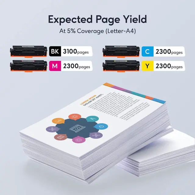 Page Yield: 3, 100 pages for black 054H toner and 2, 300 pages for each 054H color toner cartridge (Based on up to 5% coverage) ^^