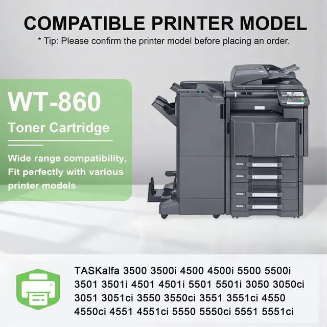• Compatible Printers for WT-860 Waste Toner Box: TASKalfa 3500 3500i 4500 4500i 5500 5500i 3501 3501i 4501 4501i 5501 5501i 3050 3050ci 3051 3051ci 3550 Printer