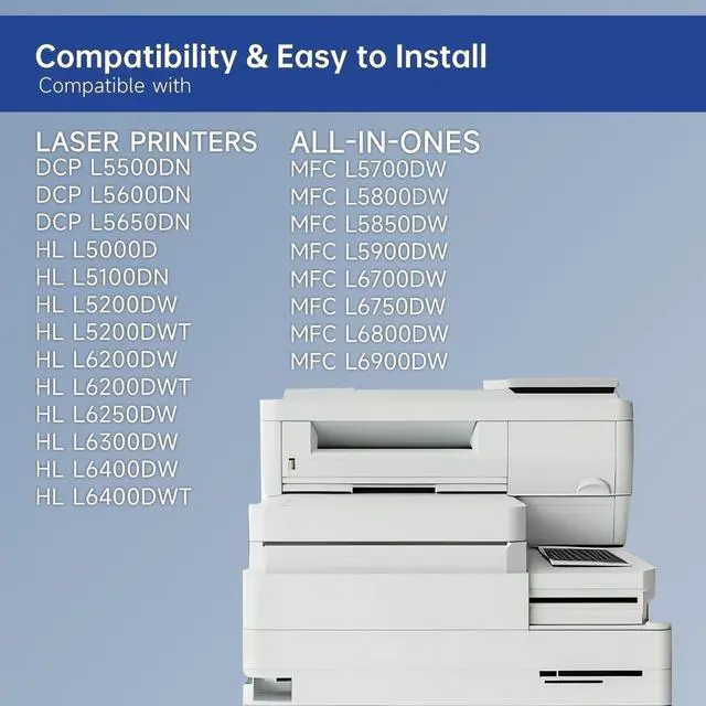 COMPATIBILITY: Works with Brother Mono Laser Printers HL series L5000D L5100DN L5200DW L5200DWT L6200DW L6200DWT L6250DW L6300DW L6400DW L6400DWT; DCP series L5500DN L5600DN L5650DN; and ALL-IN-ONES MFC series L5700DW L5800DW L5850DW L5900DW L6700DW L6750DW L6800DW L6900DW ^^