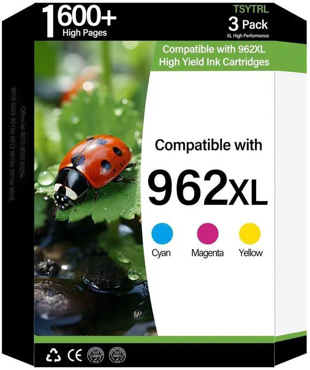 962 Original Quality & 50%-Cost SavingSave 50% with Tsytrl's remanufactured 962XL ink cartridge combo pack! Delivering identical print quality to original ink cartridges at half the cost, our printer ink is perfect for home offices, students, and small businesses looking for affordable printing solutions. ^^ 962XL Large Capacity to Print More PagesExperience exceptional printing capacity with up to 2000 pages from black and 1600 pages from color ink cartridges (5% coverage on A4). Our high-capacity HP 962XL ink cartridges deliver reliable performance for all your printing needs. ^^ Wide Compatibility with HP PrintersRemanufactured 962XL ink cartridges combo pack replacement for HP ink 962 are compatible with