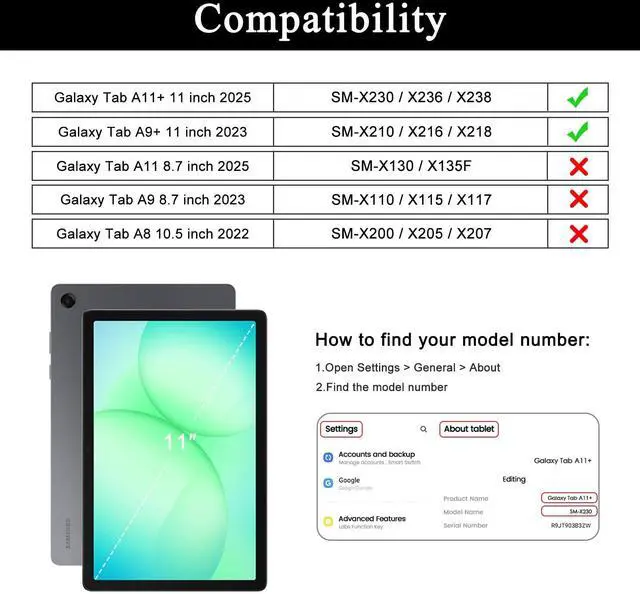 CompatibilityExclusively designed for Newest Samsung Galaxy Tab A11 Plus 11 inch(Model: SM-X230/X236/X238, 2026 Released)/A9 Plus 11 Inch(SM-X210/X216/X218, 2023 Released)ONLY. Please kindly check the model number SM-X*** at the Setting of the tablet before purchase ^^ Rugged Armor Full Protection Multi-layered hard PC back and flexible TPU bumper provide full protection against drops, bumps, and impacts, also easy to install ^^ Built-in Screen ProtectorPrevents your New Galaxy Tab A11+/A9+ 11 Inch screen from scratches without compromising sensitivity and provides full protection ^^ Built-in KickStand Functional pop-out kickstand with dual stand angles for easily enjoying movies and better working. FREE YOUR HANDS ^^ Precise Cutouts Precise cutouts and design allow easy access to all ports, sensors, speakers, cameras without removing the case