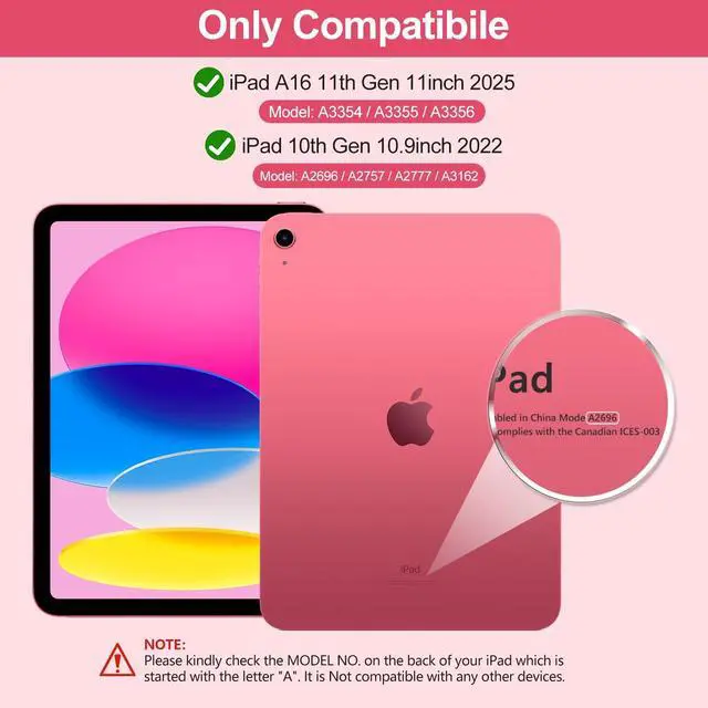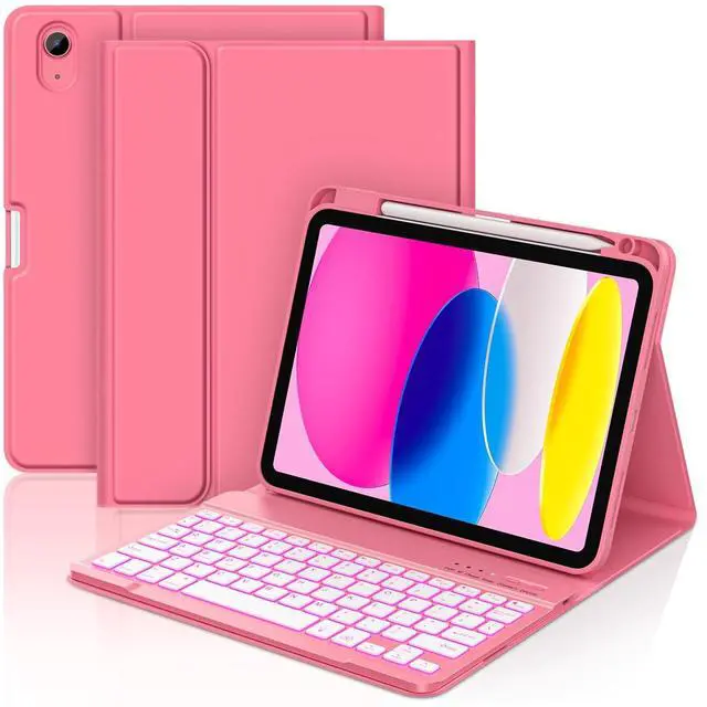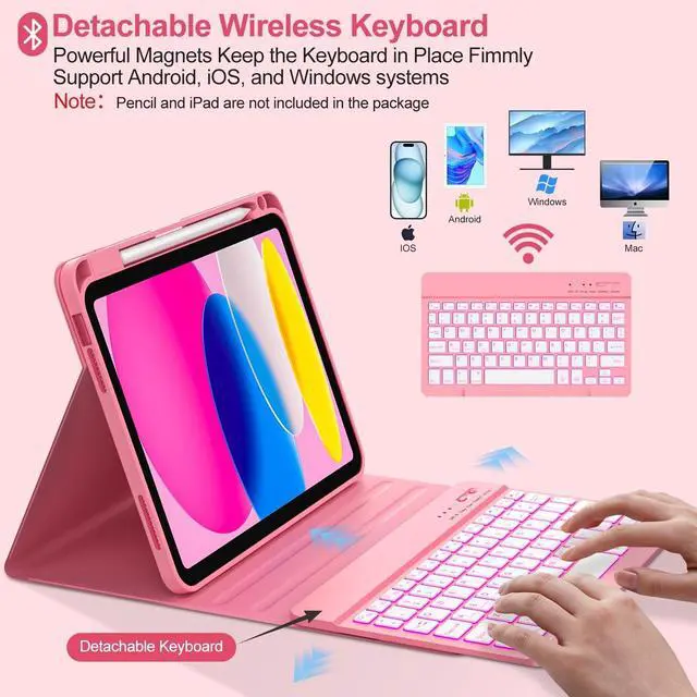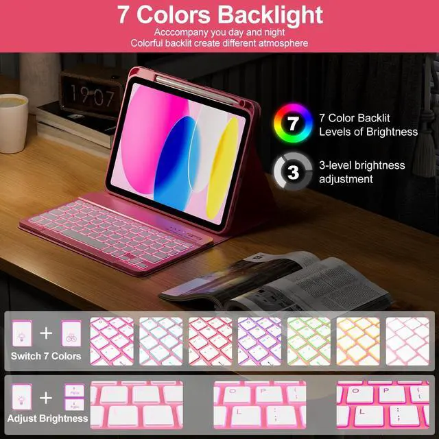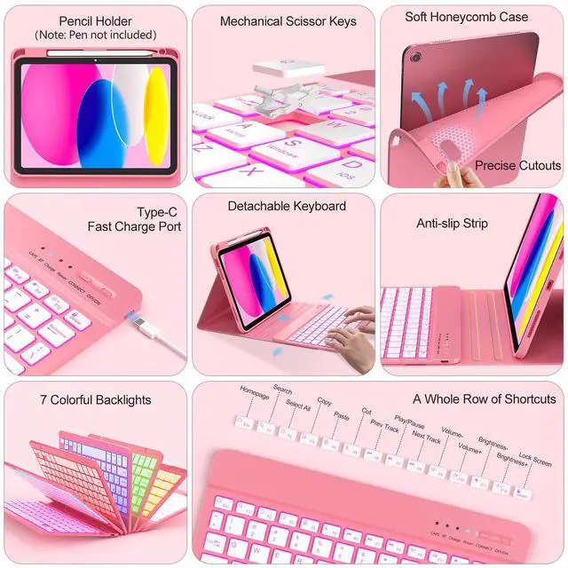 Note: Pencil and iPad not included) ^^ Multiple Viewing Angles AdjustThis for 10th gen iPad case with keyboard has 3 anti-slip grooves design to adjust the viewing angle as you like, make your tablet stand steadily. You can adjust the screen angle this way for studying, working, painting or watching videos, do more computerig, suitable for home, office or school use ^^ 7 Color Backlight, Multi-function KeysThe backlit keyboard has 7 colors, 3 adjustable brightness levels. You can switch between backlit mode and breathing light mode, making typing more fun and easier in dark environments. The backlight mode can be turned off. The entire row of shortcut keys can quickly adjust volume, brightness, switch input methods, and return to the homepage, greatly improved your productivity ^^ Built-in Pencil HolderThis keyboard case for iPad 11/ 10.9 inch 2025 A16/2022 built-in Right Side Pencil Holder and pen slot for easy storage, preventing your Pencil from being lost. The cutout in the back makes it easy to take the stylus out for use.