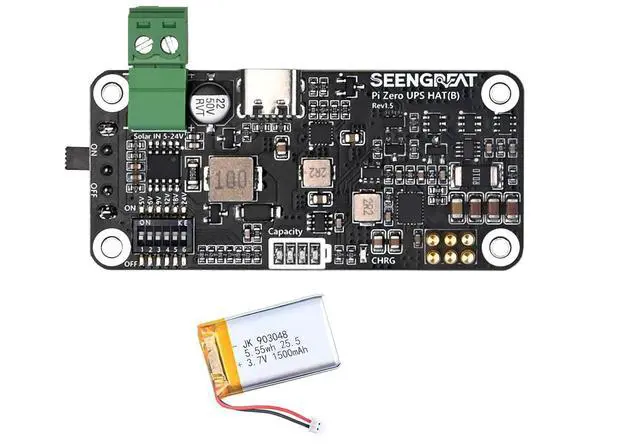 Thanks to the onboard solar input interface, the board supports 5V24V photovoltaic panels, using an MPPT (Maximum Power Point Tracking) algorithm to maximize solarcharging efficiencyperfect for environmental monitoring, outdoor sensors, or off-grid projects. The UPS HAT also includes an I2C ba-ttery monitoring chip that measures ba-ttery voltage, current, and power in real-time. Combined with an LED power indicator, users caneasily track the ba-tterys status, improving safety and system awareness. Compact yet powerful, it offers up to 9 hours of standby time with a 1500mAh ba-ttery (no peripherals connected).