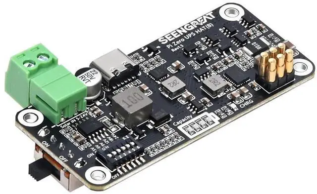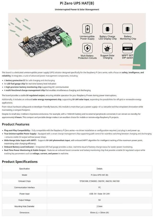 OverviewThe Pi Zero UPS HAT (B) is a compact and intelligent uninterruptible power supply board designed specifically for the Raspberry Pi Zero series, including Pi Zero, Pi Zero W, and Pi Zero 2 W. It delivers a highly integrated and developer-friendly power management solution, ideal for mobile, edge, or solar-powered Rasp-berry Pi projects. At its core, the UPS HAT integrates a multi-function charging management chip that enables simultaneous battery charging and discharging (path management), ensuringyour Rasp-berry Pi stays powered even during input power interruptions. The onboard boost converter delivers a stable 5V output, while multiple protective componentssafeguard your ba-ttery and device.