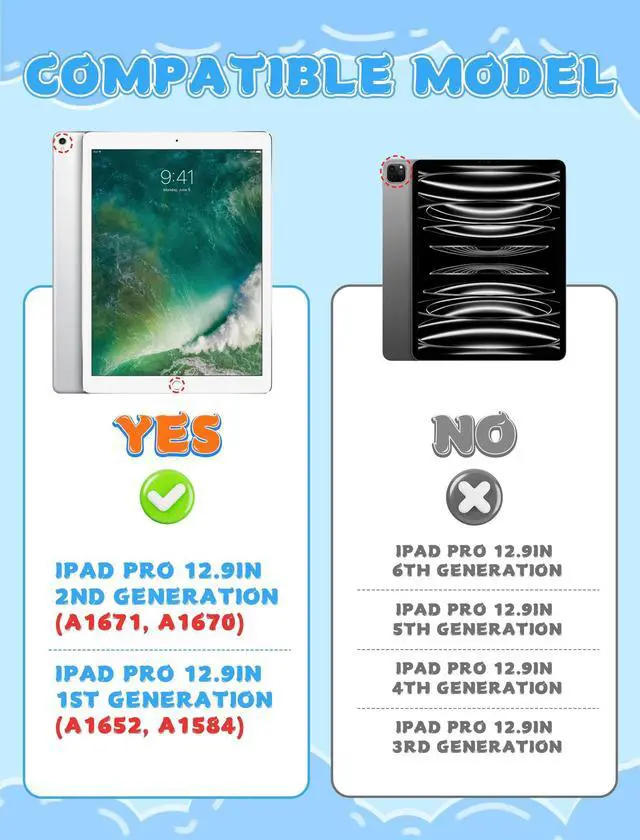 COMPATIBILITY: E-puhate kids case is designed for old models of iPad Pro 12.9 Case 2nd Generation 2017 (A1671, A1670) and iPad Pro 12.9 Case 1st Generation 2015 (A1652, A1584). It is not compatible with any other iPad models. Please check the bottom of your iPad to find the model number. (NOT for 2018-2022 3rd-6th Gen) ^^