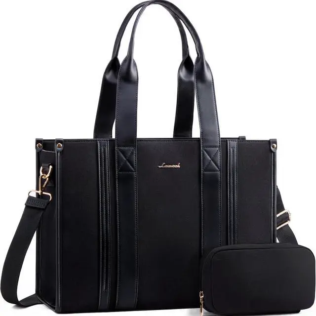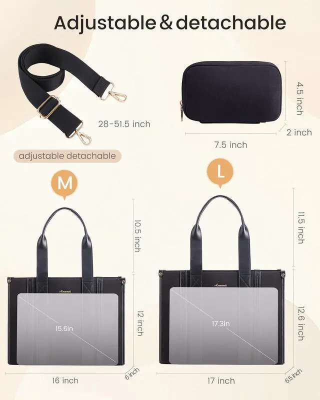 Large CapacityMulti-Pocket10 pockets keeping everything organized. It fits 40oz cups, all work stuff, a laptop, wallet, and still has a bunch of pockets for moreeverything stays organized and easy to find. Size16" x 6" x 12" (L*W*H) ^^ laptop protectionClutch bagThe padded laptop slot keeps laptops from getting damaged. This laptop tote bag for women included small pouch is perfect for all those daily essentials. clutch bag 7.5" x 2" x 4.5" (L*W*H). ^^ Durable & Water Resistantour work tote bags for women is well made, sturdy, Water Resistant, doesnt bend or fold into itself, and the material is stiff enough to hold everything up, so it stays looking great and upright.