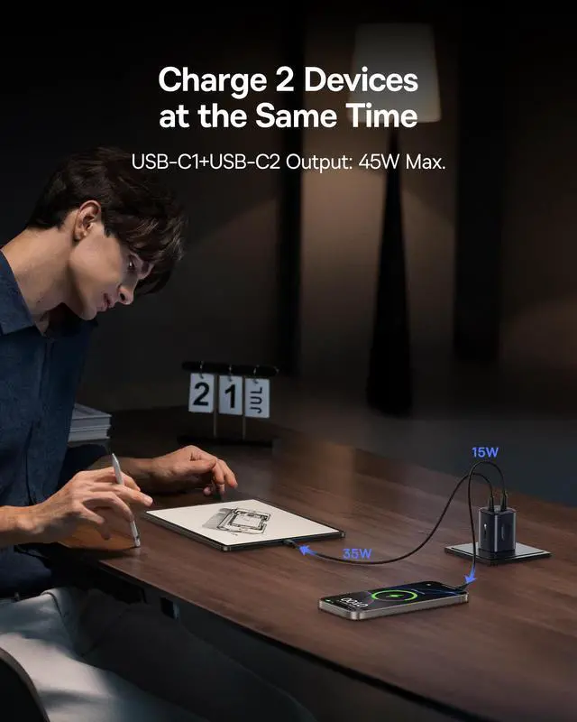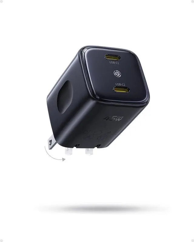45W Fast Charging: Delivers 45W power for a single port. Fast charge two devices, such as your phone, headphones, or tablet, at the same time, thanks to smart power allocation. The integrated smart chip can intelligently detect and identify the connected device, dynamically adjusting power to prevent overcharging. This fast charger supports multiple fast charging protocols, including those for iPhone and Galaxy. ^^ Smaller Size, Greater