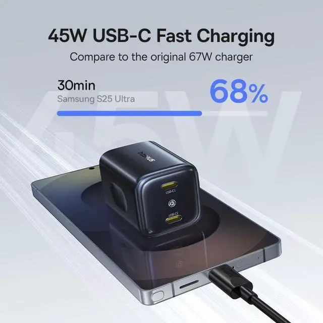 ^^ Wide Compatibility: Supports mainstream fast charging protocols including PD 3.0, QC 4.0, and PPS. Equipped with two USB-C ports, this fast charger is compatible with multiple devices, such as iPhone 17/16 series, Galaxy S25 series, iPad Pro, etc. It can adjust and allow power based on the connected device, whether it's an old or a new model.