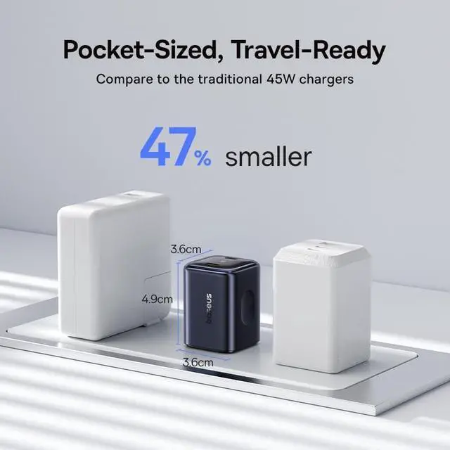 Portability: Adopting high-density integrated design, this fast charger has a volume 47% smaller than traditional 45W chargers, making it easily fit into pockets or carry-on bags. And it won't block or interrupt adjacent sockets. The foldable pin saves space and will not scratch other items when stored together. It's an ideal power companion for business trips. ^^ Stable and