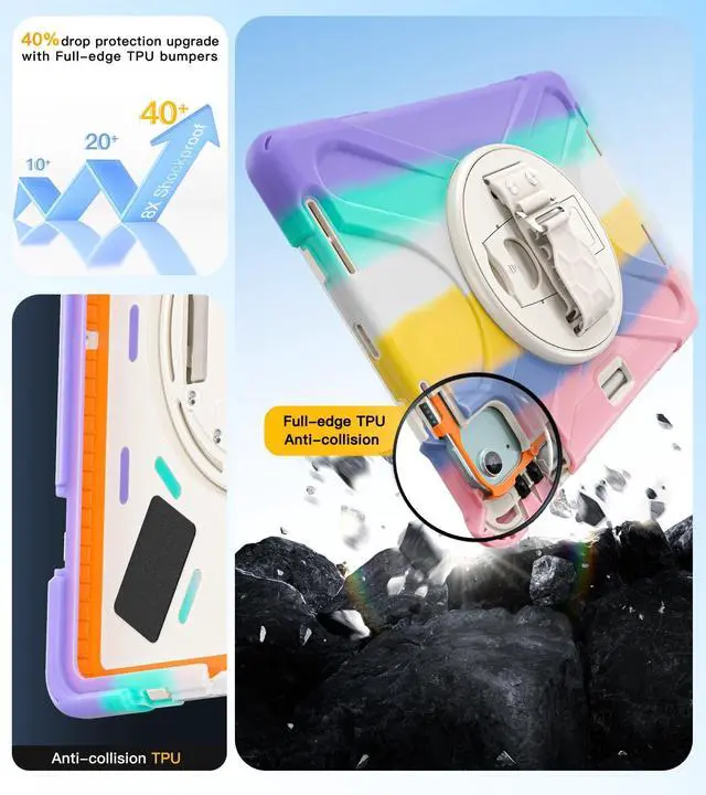Protection &Kids Friendly]: This case for ipad air 11 inch & iPad pro 11 inch features triple-layer construction and extra orange TPU cushioning strips, the outer silicone layer reinforces the dropproof performance of all four corners, plus there are 4x shockproof sponge pads on the bottom cover to prevent scratches to your tablet. Provides the ultimate in protection and durability, safe for kids to use. ^^ [360Rotating Anti-Slip Hand Strap & Stand with One-Touch Retract Button]With the rotating system as well as kickstand and Silicone handle, it makes this multi-functional case that you can use in any scenario, such as commuting, office, study, watching videos, typing. In addition, the adjustable shoulder strap can help you carry it easily, and you can also hang it on your car seat to use your tablet. ^^ [Screen Protector and
