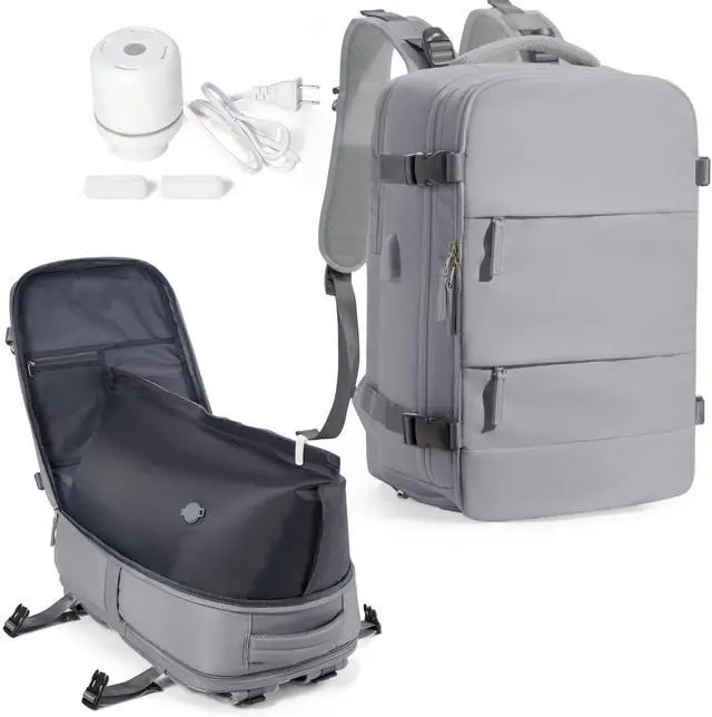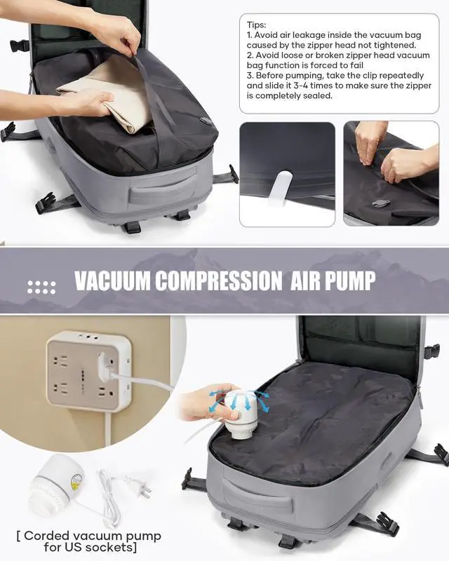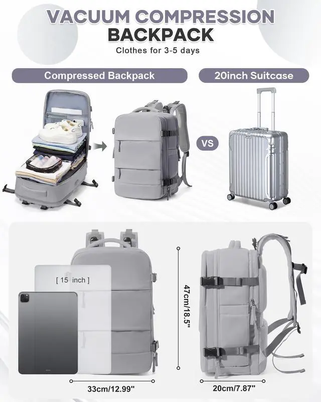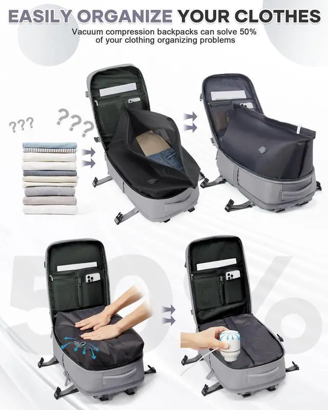 Easy to operate: Just open the valve and use a plug-in vacuum pump to pull the air out quickly, or press the air manually and close it tightly; it packs items into a compact vacuum tissue bag and experiences lightweight and effective travel in just a few minutes, and you don't have to worry about lack of storage space and long loading times. (with vacuum pump) ^^ [MULTI-FUNCTIONAL POCKETS] This backpack is more than just a vacuum bag, it has 1 main large compartment and 7 assigned inner and front pockets, which can hold a 15.6 -inch laptop, 13-inch iPad, various toiletries, cosmetics, passport or other personal belongings. The sensible pockets keep your items organized and easier to find. ^^ [USB Charging Port] The travel backpack has a built-in charging port, so you can charge your phone anywhere, anytime. This is a great travel essential for those who are always on the go and need to keep their devices fully charged. ^^ [Wet Bag and Shoe Compartment Design] The wet bag is made of high-density waterproof material, which can help you separate wet and dry.