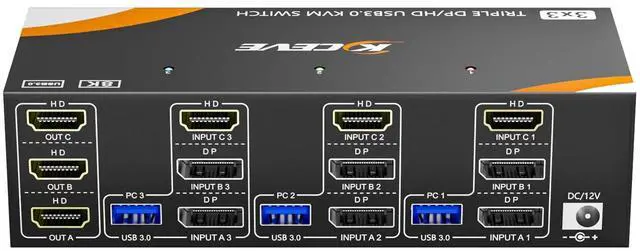 Please Note: Using 8K cables will solve the problem of flickering and black screen ^^ KVM Switch 3 Computers 3 Monitors Share 4 USB 3.0 Port up to 5GbpsTriple Monitors KVM switch DP HDMI for 3 computers share 4 USB 3.0 devices without unplugging, Securely Identify Keyboard, Mouse, printer, scanner and other USB devices. USB 3.0 KVM switch support ultra-fast data transfer up to 5Gbps. Compliant with Displayport 1.4, HDMI 2.1, HDCP 2.3. Good choice for business meeting, office, monitoring room, home office ^^ 2 Switching Methods Easy to install. Freely switch between 3 computers by KVM Switch Displayport HDMI button or 1.5 m wired remote controller (included). The LED light indicate which computer is active. Please connect the DC 12V charger.
