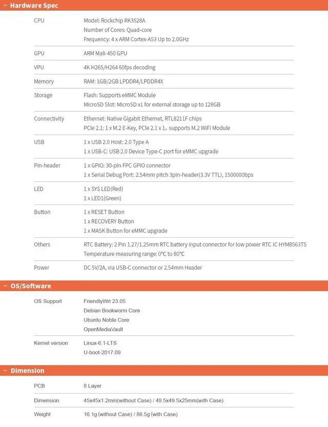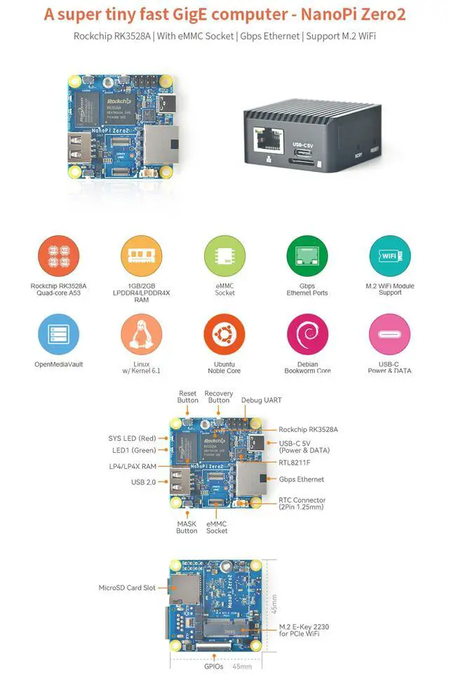 Power supply: 5V/2A, via USB-C connector. ^^ [Super Tiny Fast GigE Computer] NanoPi Zero2 computer mini router ported an FriendlyWrt system for it, and onboard one Native Gigabit Ethernet port. Support USB WiFi Module Adapter, check USB WiFi Device with Command Line Utility, Configure a USB WiFi Device as AP. ^^ [Support NAS Applications] The NanoPi Zero2 mini wifi router is be equipped with an integrated CNC anodized aluminum case and M. 2 PCIe Wifi Module (Version with wifi module). It is a good platform for developing IoT applications, Excellent 4K video decoder and NAS applications etc. ^^ [OS/Software Support] The NanoPi Zero2 mini smart gateway support FriendlyWrt 23.05, Debian Bookworm Core, Ubuntu Noble Core, OpenMediaVault and etc. The NanoPi Zero2 is another fun board developed for makers, hobbyists and fans. ^^ [SDK