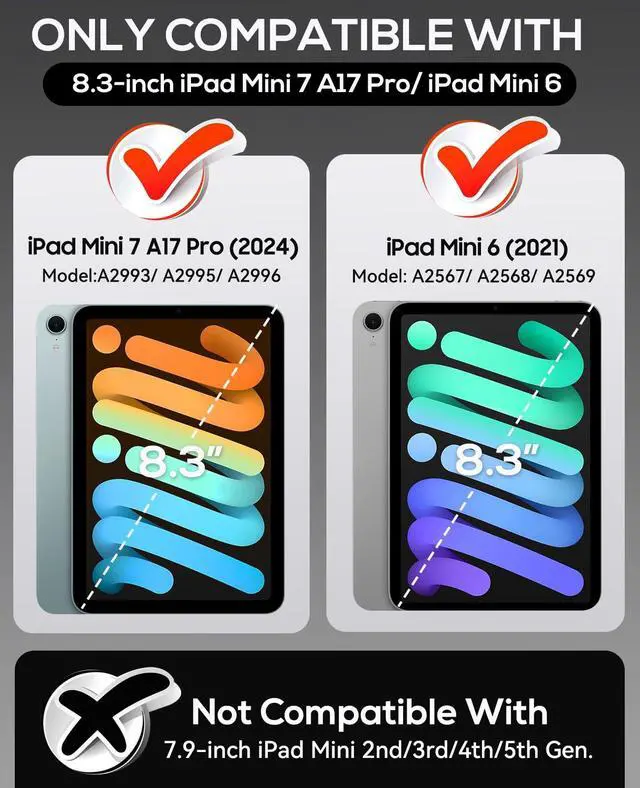 Compatible Models: This case design for 8.3 inch iPad Mini 7 A17 Pro 2024 (Model: A2993/ A2995/ A2996), iPad Mini 6 2021 (Model: 2567/ A2568/ A2569). Note: NOT with screen protector. No fits for any other tablet models