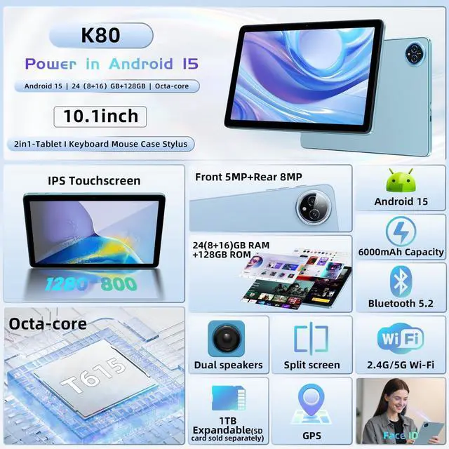 [Latest Android 15 Tablet with High-Performance Octa-Core] Experience seamless multitasking on this 10 inch Android tablet powered by the latest Android 15 OS. Equipped with a high-speed octa-core processor, 24GB RAM (8GB+16GB virtual RAM), and 128GB ROM (expandable up to 1TB via external memory card), this tablet PC ensures fast app launches, smooth gaming, and lag-free streaming. Perfect for electronics tablets enthusiasts seeking speed and reliability. (1TB card not included). ^^ [Vibrant 10.1 -Inch IPS HD Display & Stylus Support] Enjoy crystal-clear visuals on the 1280x800 resolution HD touchscreen, ideal for movies, games, or creative work.