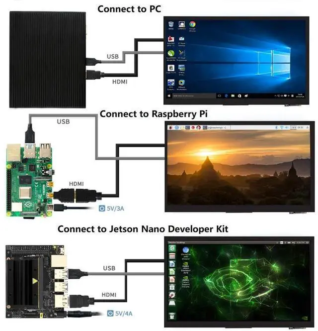 Introduction7IP-CAPLCD is an universal HDMI display, an IPS screen with 1024x600 resolution. It has a capacitive touch panel, supports up to 5-points touch. Supports Raspberry Pi, Jetson nano Developer Kit, can be used as a monitor of desktop PC. Advantage1. Connect to PCThe display supports Windows 7/8/ 8.1 /10 when working with Windows PC, supports 5-points and it is driver free. NoticesIf the screen doesn't display after connecting, please check if you connect all the cables properly, replug them and test it again. Sometimes you may need to restart PC if the PC doesn't support hot-plug.
