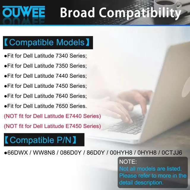 Condition: New; ^^ Fully compatible and high stabilityFit for Dell Latitude 7340 Series; Fit for Dell Latitude 7350 Series; Fit for Dell Latitude 7440 Series; Fit for Dell Latitude 7450 Series; Fit for Dell Latitude 7640 Series; Fit for Dell Latitude 7650 Series. (NOT fit for Dell Latitude E7440 Series; NOT fit for Dell Latitude E7450 Series) ^^ Replacement Battery Part NumbersBattery for 66DWX / WW8N8 / 086D0Y / 86D0Y / 00HYH8 / 0HYH8 / 0CTJJ6 ^^ OUWEE Perfect After-saleRest assured with 30 days money-back and 12 months Warranty; 24 x 7 email support. Any questions you can contact with us via "Your Orders" tab in account. We are committed to resolving any situation in which our product does not meet your expectations. ^^ Safe to UseAll OUWEE products are Certified by UL / CE / FCC / RoHS for safety. Strict guidelines for compatibility, strict quality control standards to ensure the true capacity, stable current and low self-discharge and standards compliance for environment safety. We are confident in the performance of the replacement battery. ^^ AdviceIn the event that the new battery fails to be recognized upon initial installation, kindly reinstall it and verify whether the interface is fully connected.