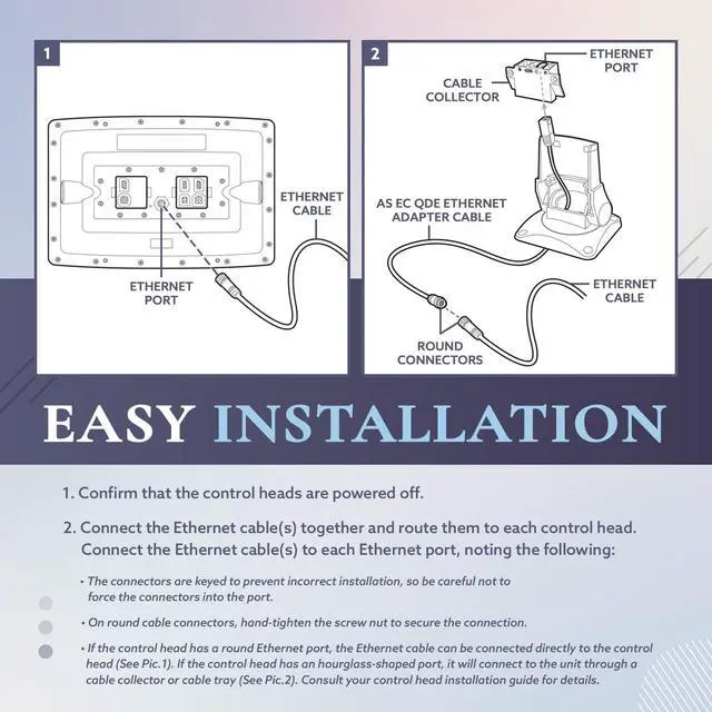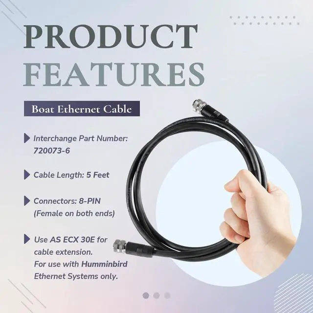 Connectors: 8-PIN (Female on both ends). Use AS ECX 30E for cable extension. For use with Humminbird Ethernet Systems only. ^^ STRONG FUNCTIONThe Ethernet cable is a 5-foot cable that connects two Ethernet-enabled devices or connects the Humminbird control head to an accessory 5-port Ethernet switch (AS ETH 5PXG) as part of a multi-device Ethernet network. ^^ SUPERIOR MATERIALThe 720073-6 Ethernet Cable is made of highly durable Rubber, Copper, Plastic, and Aluminum Alloy. Rigorously tested, compact, and sturdy. Meet OEM manufacturing requirements. High-quality materials allow it to be used for a long time. ^^ 100% Satisfaction GuaranteeWe are committed to providing excellent products and the best service for our customers. If you are not satisfied with the product, you can simply return it. We support a 30-day refund on return and a 12-month warranty.