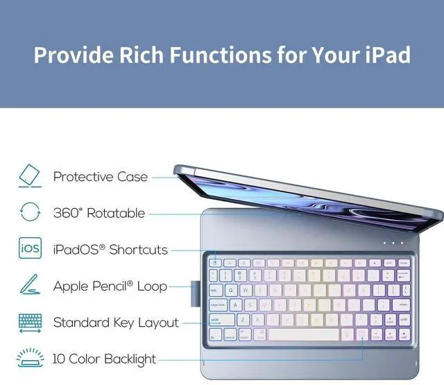 • Multi-Angle iPad Pro 11-inch CaseThe ipad pro 11-inch case rotates 360 rotation and 180 flip,offering multi-angle viewing. You can adjust the screen to any desired angle when you are watching videos, playing games or simply typing. This feature allows you to assume any posture or place your iPad anywhere you like without straining or being affected by reflections. At the same time, the ipad pro 11-inch keyboard case comes with a special pencil holder compatible with apple pencil