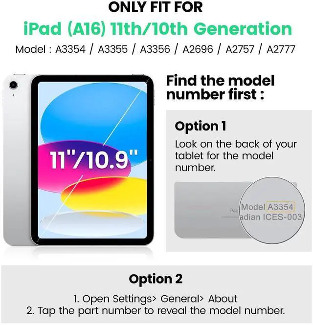 Compatibility: Only fits for iPad (A16) 11th/10th Generation 2025/2022 (11/ 10.9 ), (Model: A3354, A3355, A3356, A2696, A2757, A2777); please double check the model number on the back of tablet (A****) before purchase.
