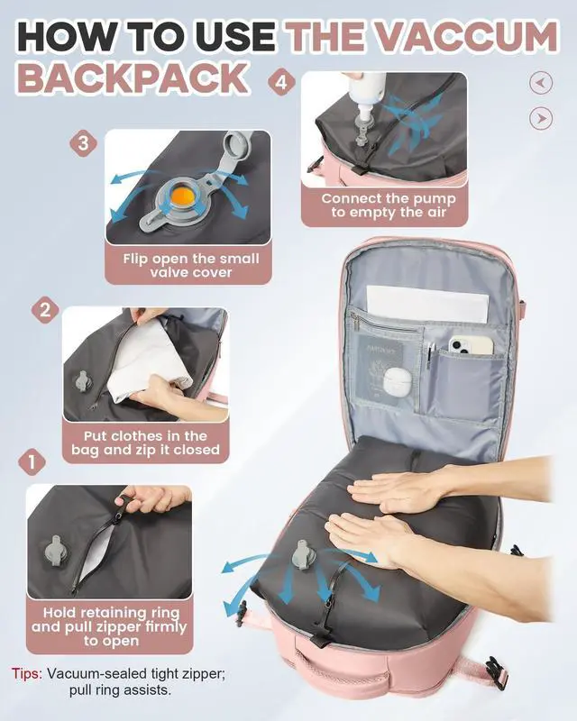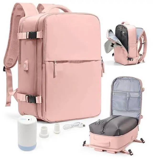 Fast Compression - FAST COMPRESSION - This backpack with AIR PUMP. compression system features bi-directional valve chambers for easy space savings. Use the included electric vacuum pump to quickly compress items (or simply press manually to release air) and also inflate items. Enjoy optimized storage space and minimize wasted luggage space. ^^ Waterproof & Durable - Featuring a water-resistant nylon exterior and a fully waterproof interior vacuum-sealed compartment, the bag keeps its contents dry even in heavy rain. Pressure-reducing shoulder straps and a breathable back pad ensure all-day comfort. ^^ USB Charging On-The-Go - USB charging port lets you power devices without opening the backpack - simply connect your power bank to the internal cable (power bank not included).