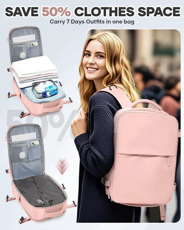 The scratch-resistant port cover maintains weather resistance while providing instant access to charge phones/tablets during travel, hiking, or daily commutes. ^^ Multi-Functional for Any Scenario - Perfect for travel, gym, or daily use! Features a main compression compartment + front accessory pocket + dedicated shoe compartment to keep clothes and essentials neatly organized. ^^ Airline Approved Backpack - Save on check-in fees by meeting major airline carry-on baggage size standards. Reduces the risk of lost luggage. The back can be snapped on to the trolley handle to create an integrated mobility solution, allowing you to travel through airports with ease.