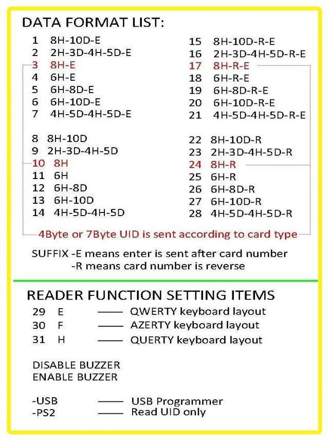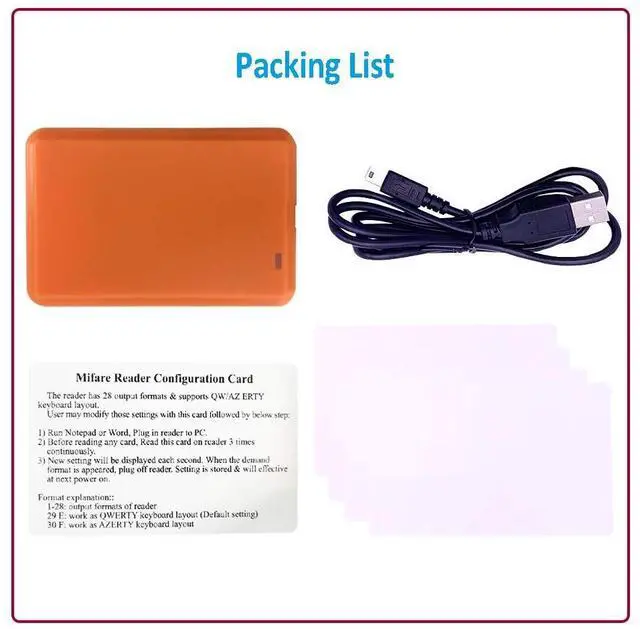 . 1 Mifare card WRITER/Mifare Card UID READER simulate keyboard input/Mifare Card UID READER USB 2.0 communication; The Reader intergated 3 working modes, switched with config card. ^^. 2 Mifare card READER mode reads UID of 14443A Mifare card, include Mifare Classic, UltraLight, Mifare Plus, Mifare Desfire, Mifare N-TAG/card emulation. ^^. 3 Mifare 13.56MH z RFID READER interface is HID USB, has 28 output formats, Configurable to simulate USB keyboard input or USB 2.0, supports Android Linux Windows iOs (OTG adapter is requested under Android) ^^.