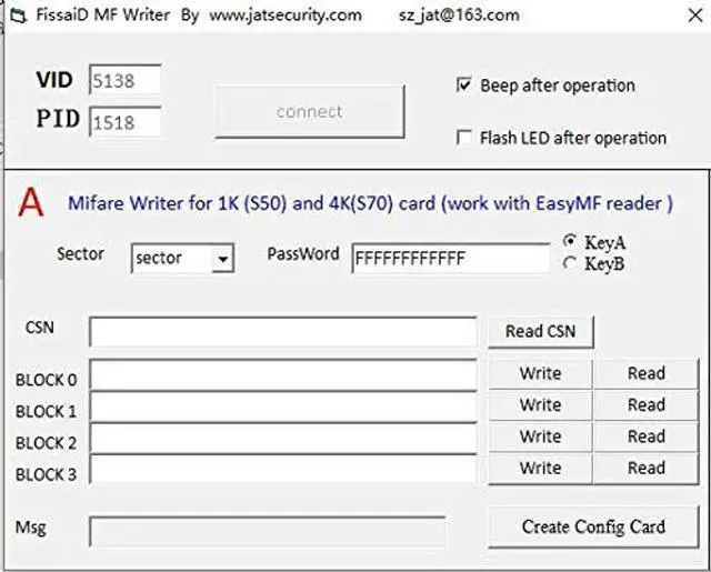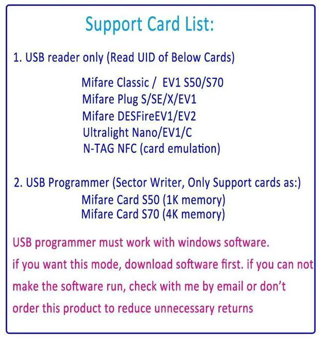 4 Mifare card WRITER mode is USB 2.0 interface, Program Mifare Classic 1K/4K card sector data. ONLY Windows software is provided & it supports 1K/4K memory card only. ^^. 5 Mifare 13.56M Writer supports the 2nd development with your own program, I can provide debug demo programmer by email