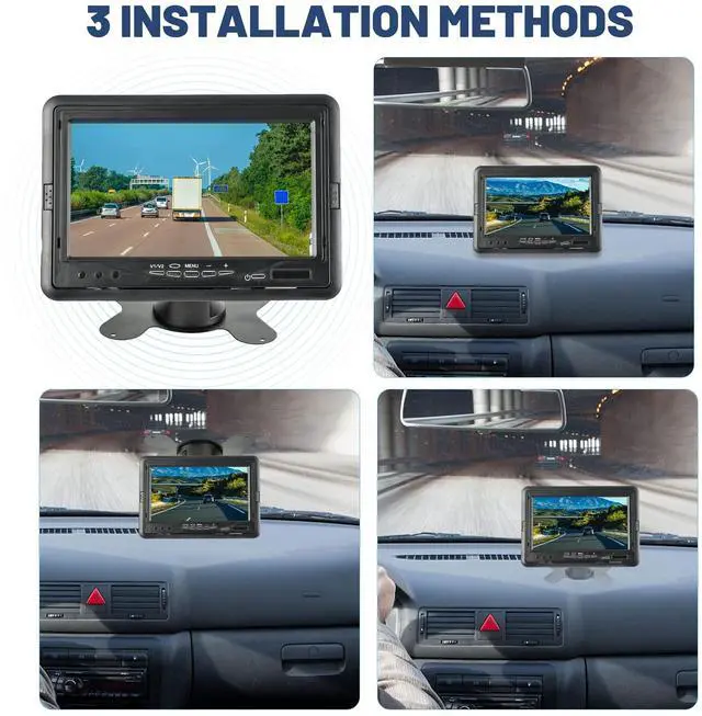 ^^ Package Included: 1x 7 inch LCD Monitor; 1 x Suction Cup Mount; 1 x Dashboard Stand; 4 Video Input Power Cable; 1* IR Remote Control.