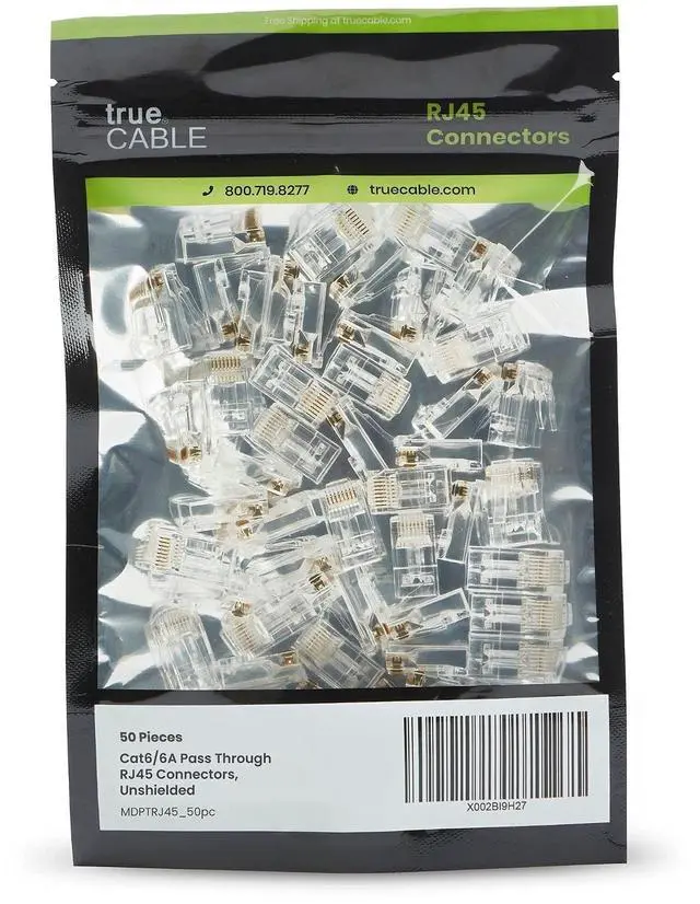 Supports Power over Ethernet: PoE/PoE+/PoE++ (IEEE 802.3 af/at/bt) 4PPoE up to 100W. ^^ [Versatile] Works with 23AWG stranded or solid conductors. Suitable for cable jacket diameters up to 7.30 mm and conductor insulation diameters from 1.05 - 1.15 mm. Terminate with our All in One Crimp and Termination Tool. ^^ [Premium Quality] ANSI/TIA 568 2. D Certified and Validated with trueCABLE U/UTP Ethernet cable. ETL, UL, SGS (RoHS REACH / SVHC) Verified and Tested. FCC compliant. ^^ [Resealable Bag] These transparent gold plated RJ45 plugs are sure to make your install hassle free.