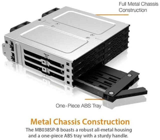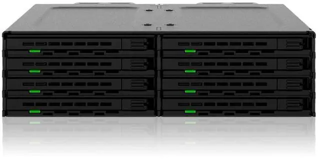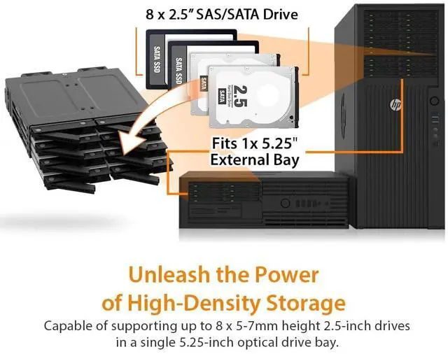 Accommodates up to 8 x 2.5" SAS/SATA HDDs/SSDs in a single 5.25" bay ^^ Accommodates 2.5" drives with 5mm & 7mm height ^^ Removable drive tray system for easy maintenance and hot-swap support ^^ Supports SATA 3.0 6Gbps or SAS 3.0 12Gbps (single channel) ^^ Dual 40mm fans for efficient drive cooling