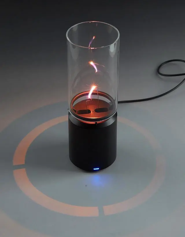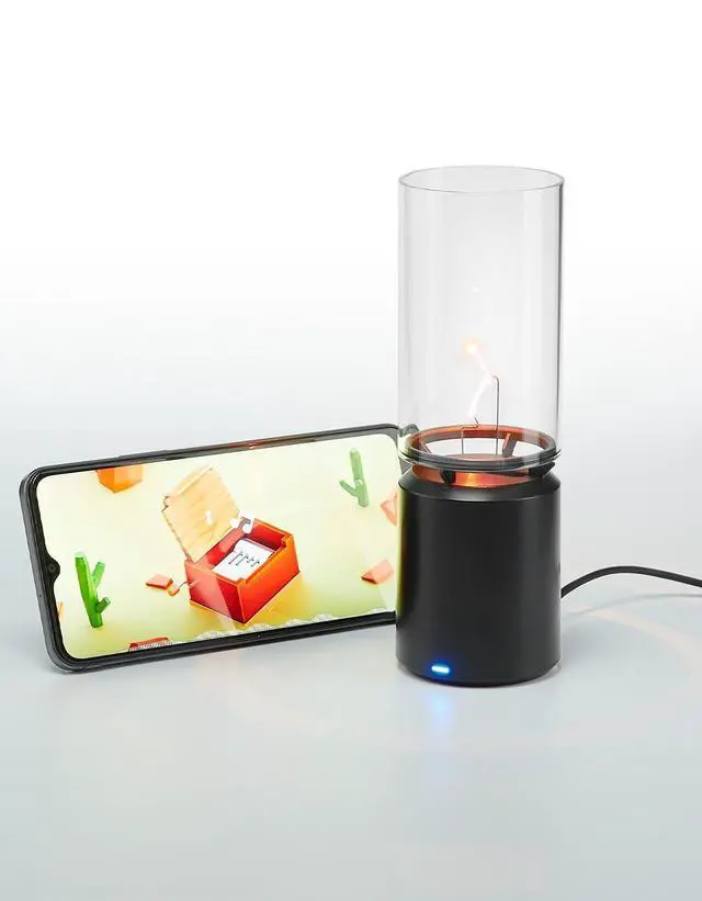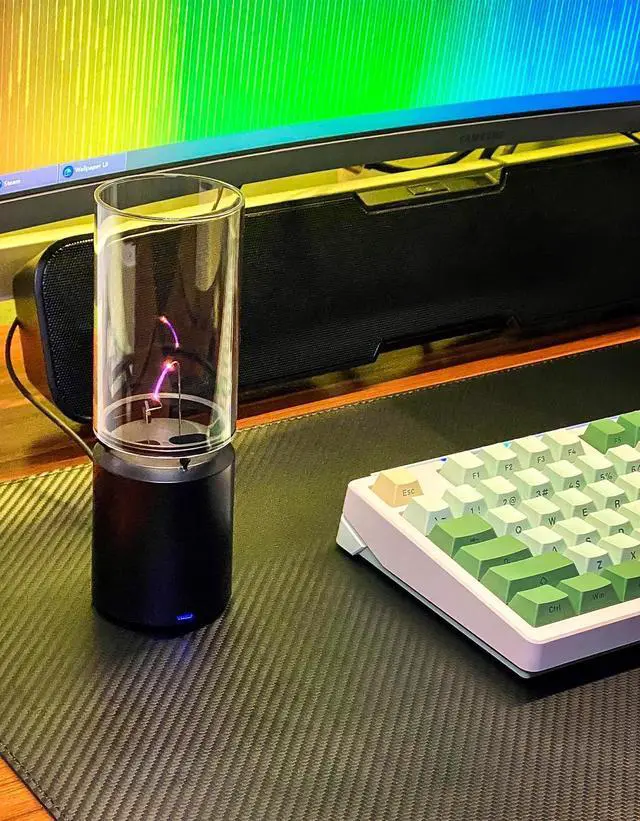 Your Music: Plasma Flame Visualizer] Elevate your desk setup with a living arc of light. Inspired by Teslas 1891 patent, the violet-pink plasma flame dances(extremely slightly and stabilizes with your music. Its the ultimate cyberpunk visualizer for your gaming station or home office, adding a futuristic glow that standard RGB lights cant match. ^^ [High-Fidelity "Near-Field" Audio] Experience sound differently. Using diaphragm-free plasma technology, the electric arc is the speaker. It delivers crystal-clear highs and detailed vocals with near-zero distortion. Perfect for enjoying jazz, vocals, or game soundtracks while working or relaxing at your desk. ^^ [Designed for Personal Space - 55dB]