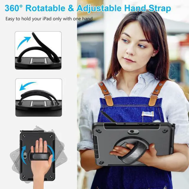 DEGREE ROTATING STAND: There is a sturdy swivel foldable stand. View your iPad in horizontal and vertical mode. Convenient for watching videos, conferences, construction, Free your hands ^^ ADJUSTABLE HAND STRAP +
